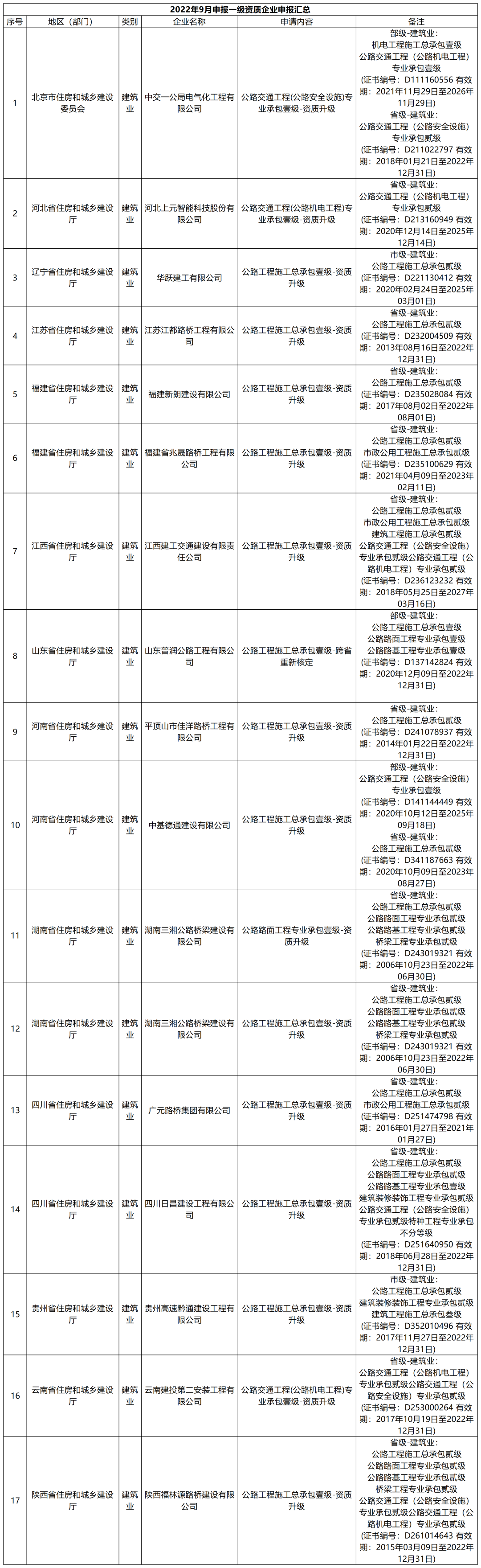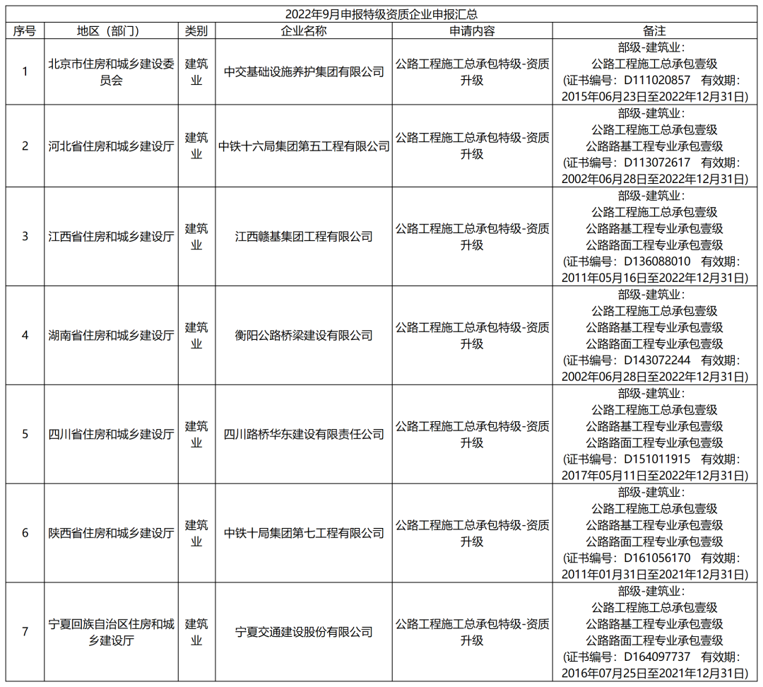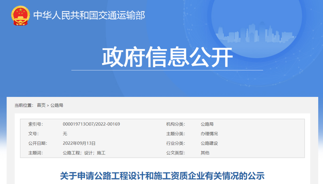 為保證申請資質企業相關情況的真實性和資質評審工作的準確、公正,現將近期申請公路工程設計、施工資質的企業有關情況予以公示,接受社會監督。公示時間為2022年9月13日至2022年9月19日。