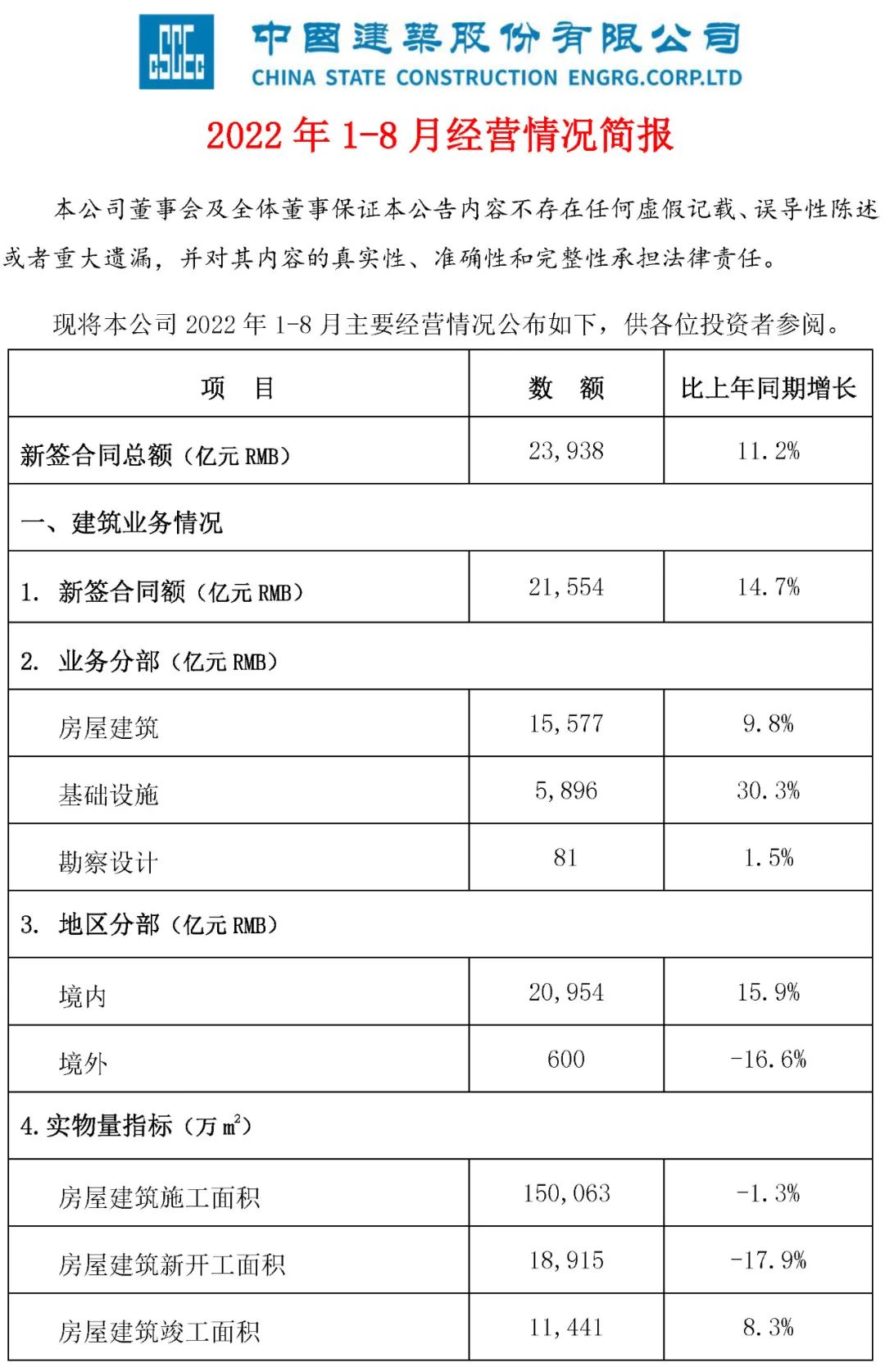 9 月 16 日晚間,中國建筑發布企業最新經營情況簡報,根據公告顯示,2022 年 1-8 月,中國建筑累計新簽合同額 23938 億元,同比增長 11.2%。