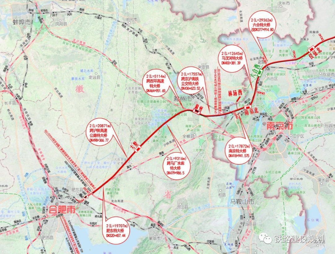 新建上海至南京至合肥高速鐵路(安徽段):蘇皖省界至合肥南(不含),里程范圍:DK427+948.09~合寧K460+579,線路長度130.88km,其中新建線路長度103.001km,利用既有線長度27.879km。其中橋梁工程長85.06km,隧道工程長6.47km,橋隧占比88.86%,利用既有線27.88km。
