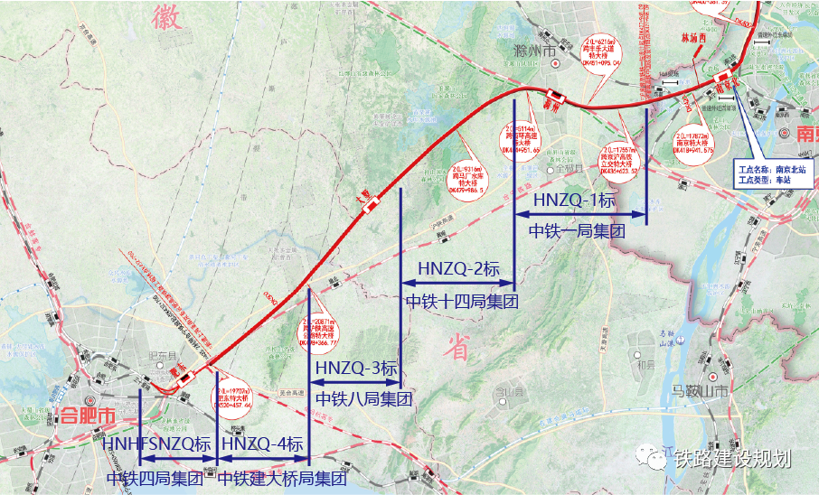 滬渝蓉高鐵安徽段標段劃分及中標單位示意圖